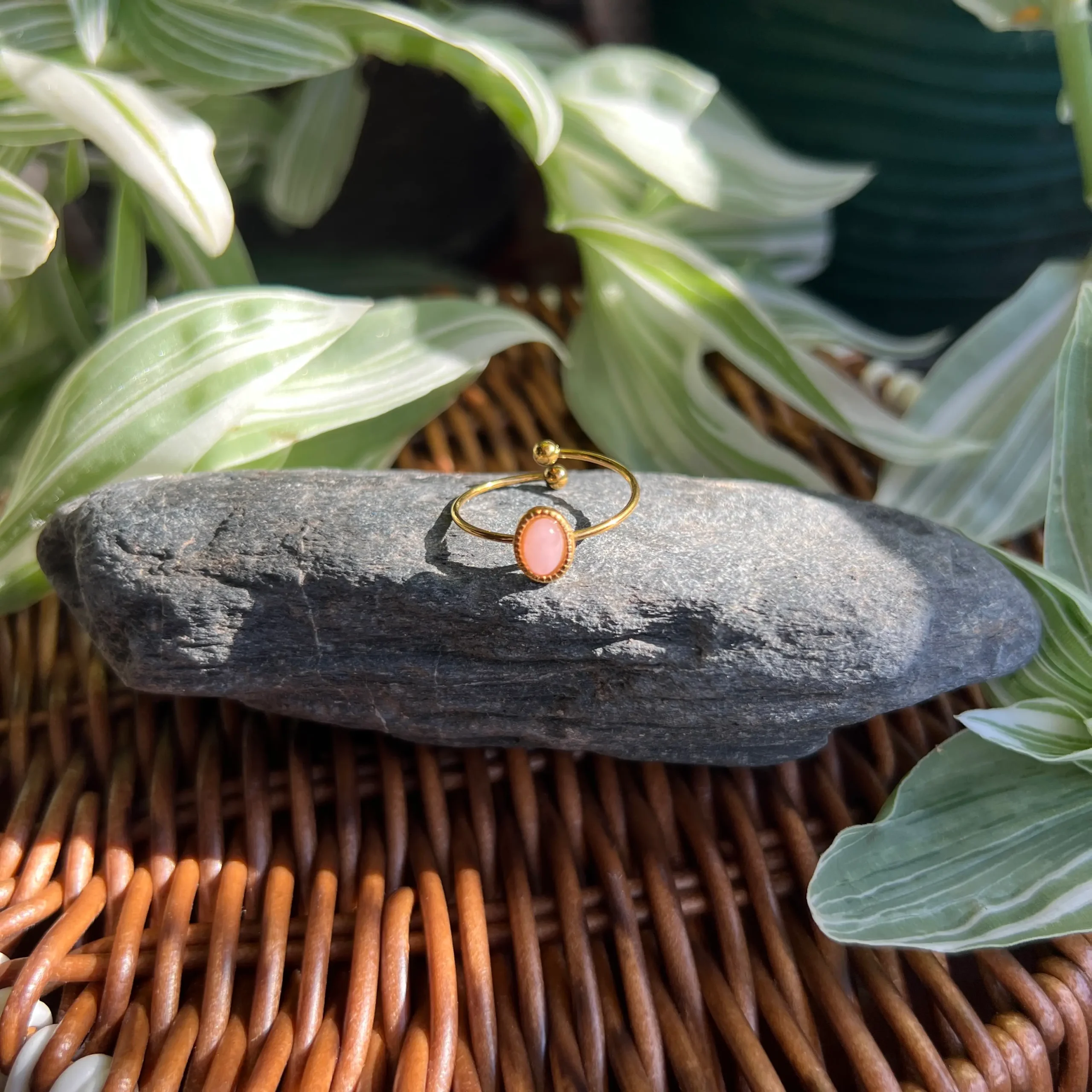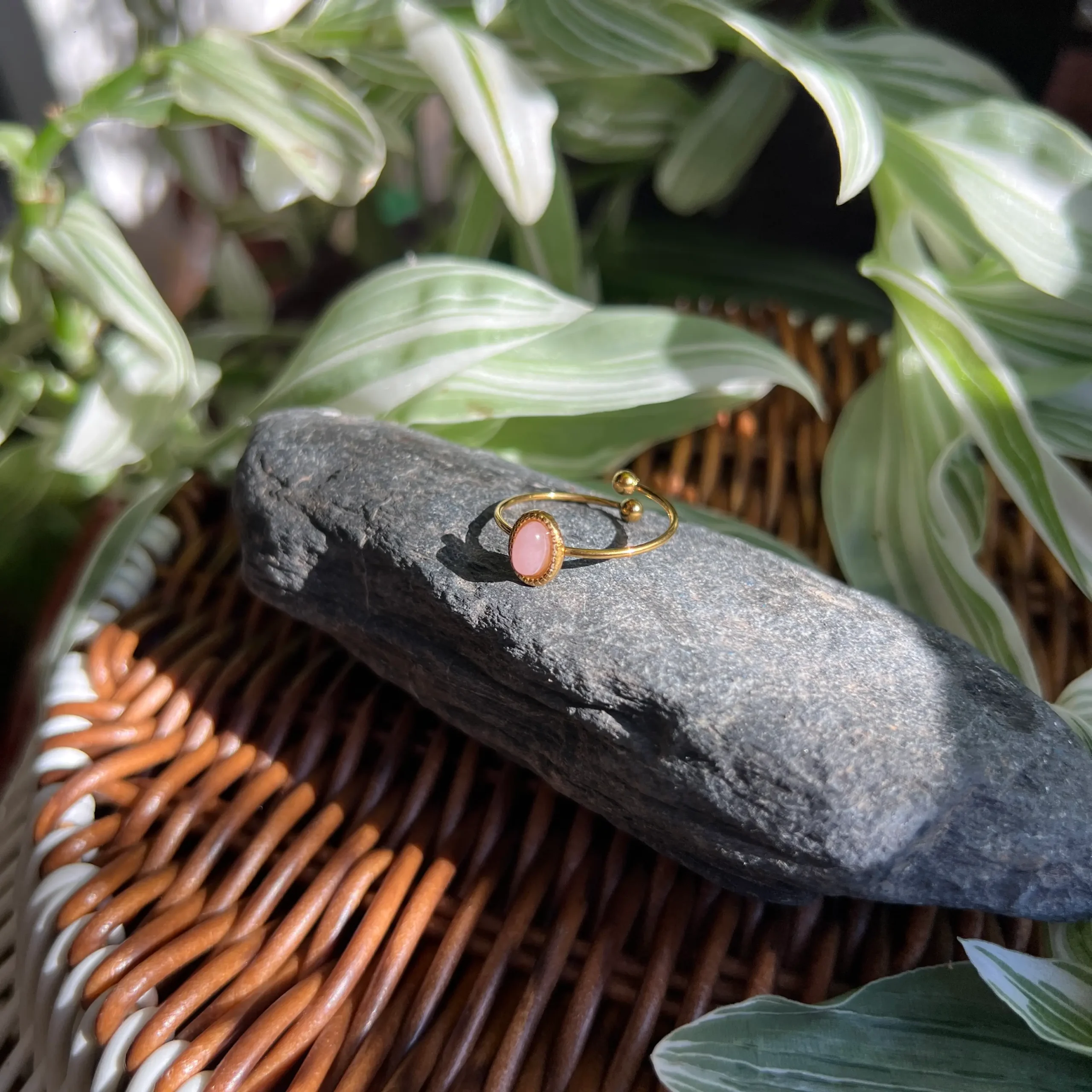 Este anillo ajustable de cuarzo rosa combina un diseño elegante con materiales resistentes: acero inoxidable con baño de oro 18K, ideal para quienes buscan una joya delicada, duradera y con intención. El cuarzo rosa, conocido por su energía suave y amorosa, aporta un toque romántico y sofisticado que eleva cualquier look, desde el día a día hasta ocasiones especiales.