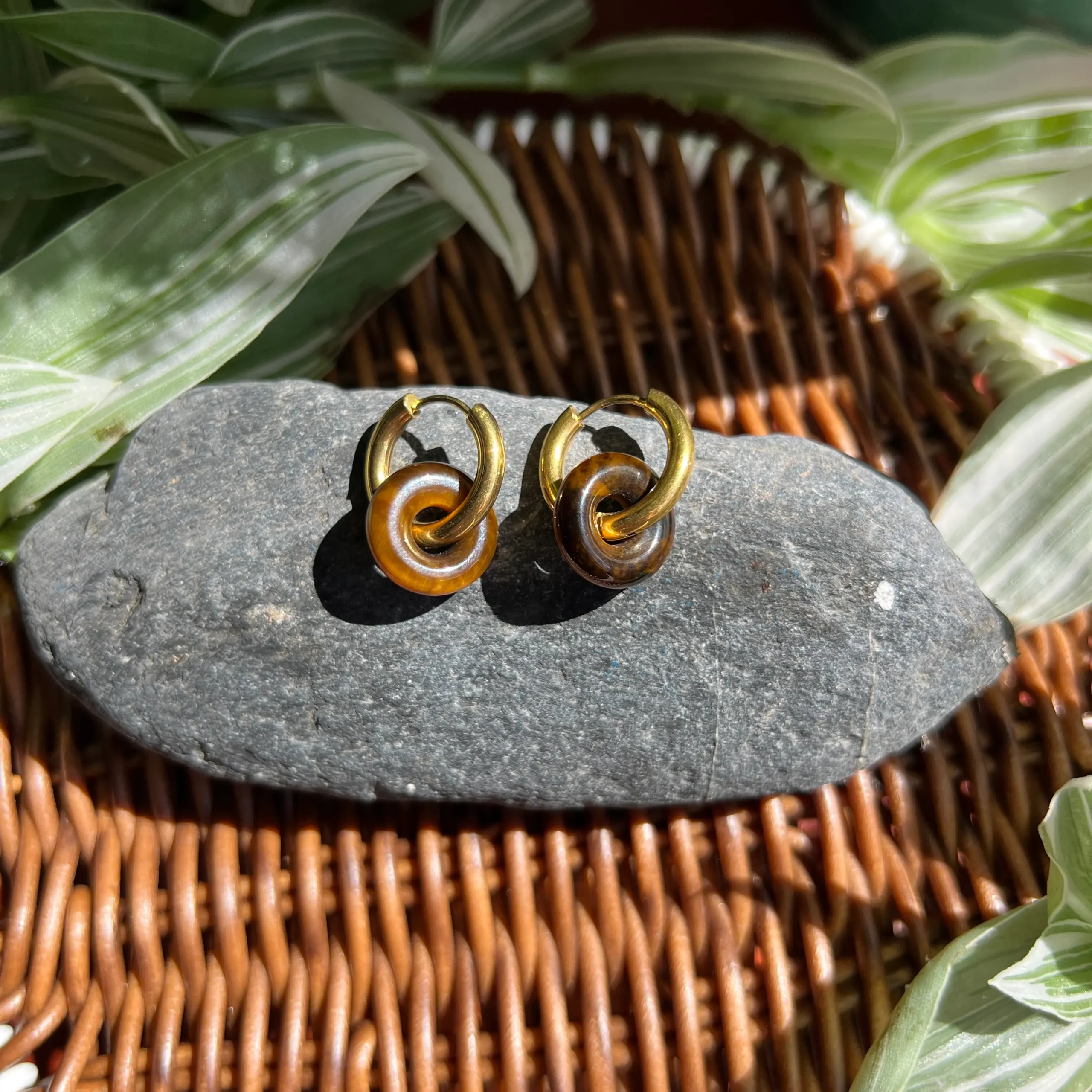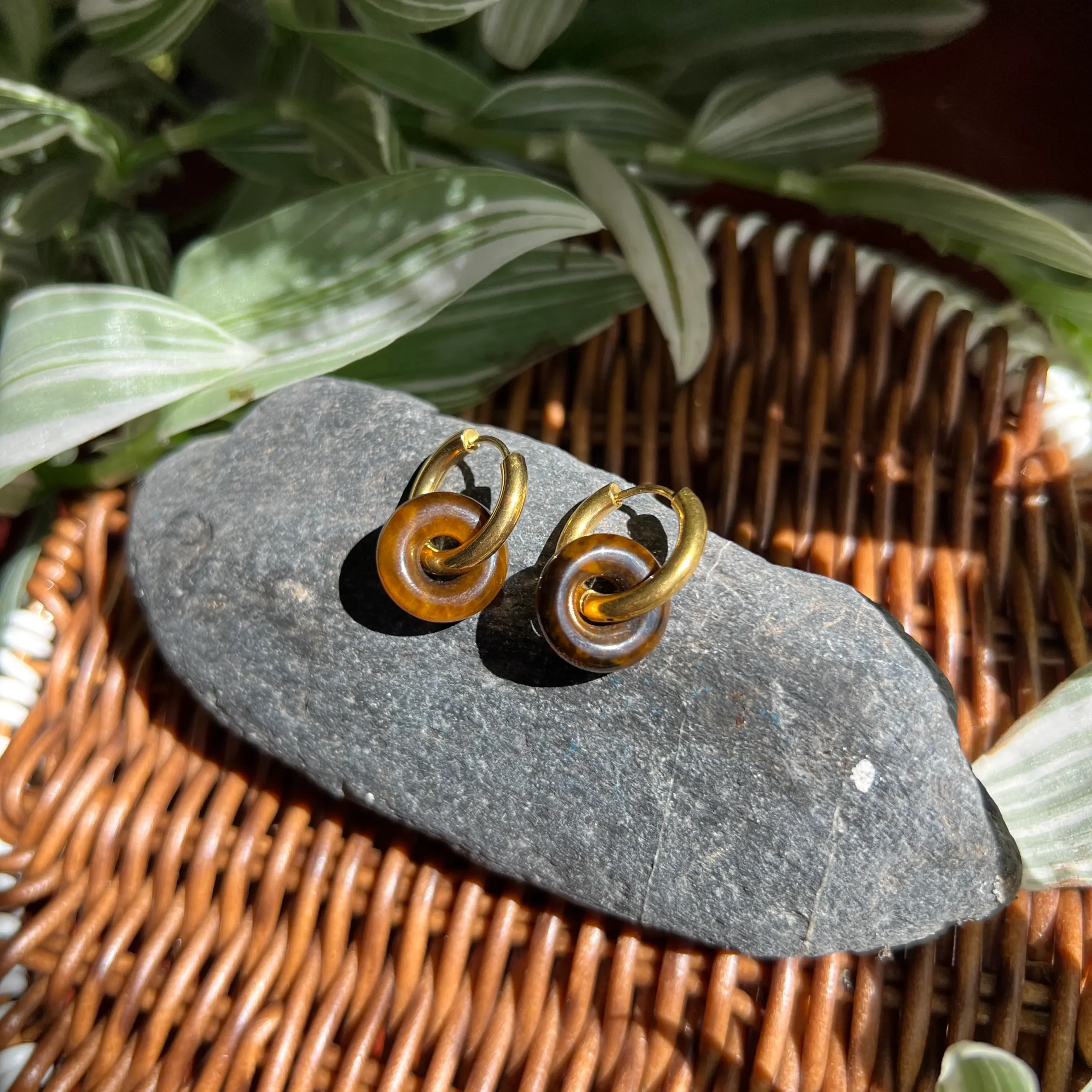 Eleva tu estilo con un diseño moderno y lleno de intención: estos pendientes dorados de acero inoxidable incorporan un dije en forma de donut de piedra natural, una silueta elegante y simbólica (asociada a armonía y continuidad) que combina perfecto con looks minimalistas, bohemios o sofisticados.