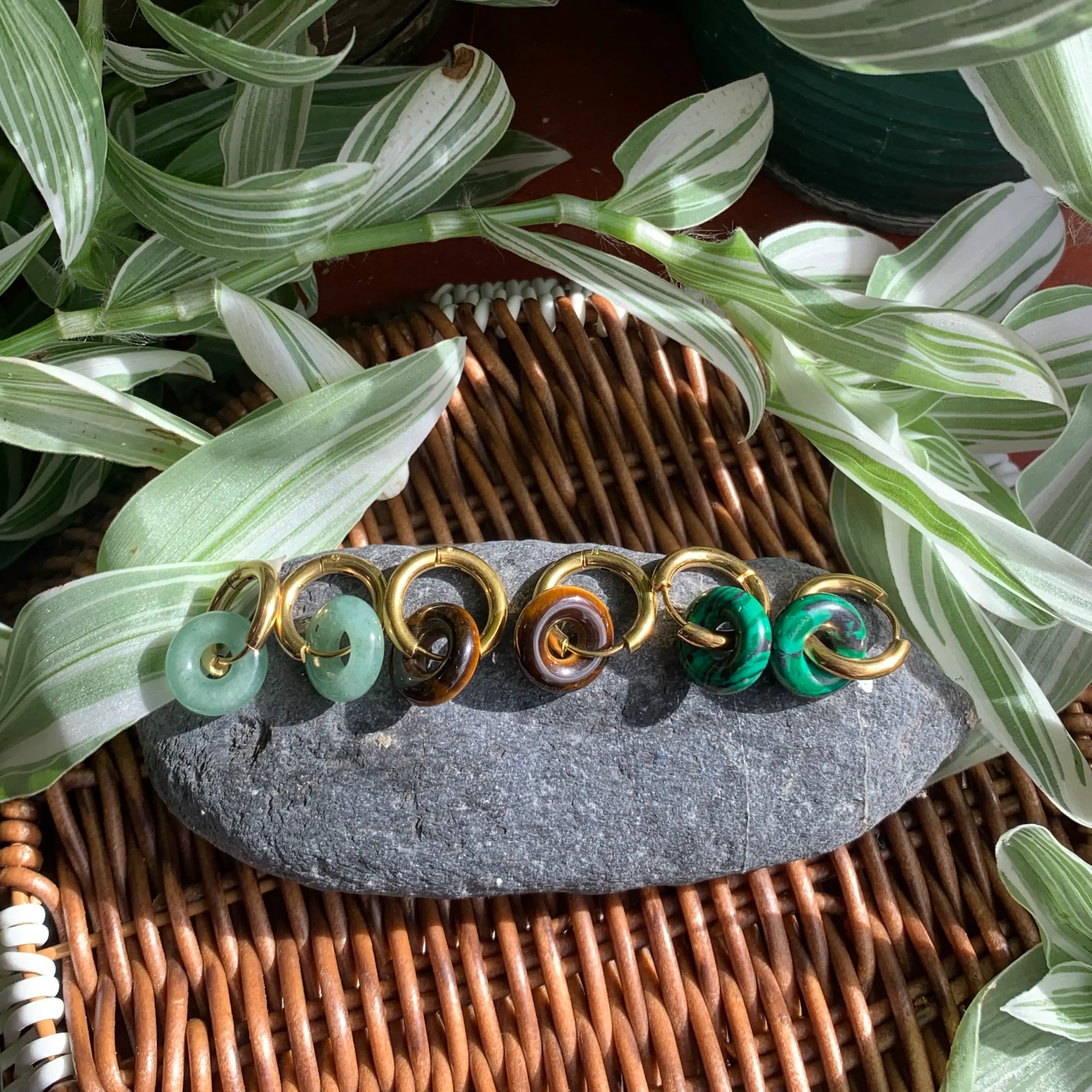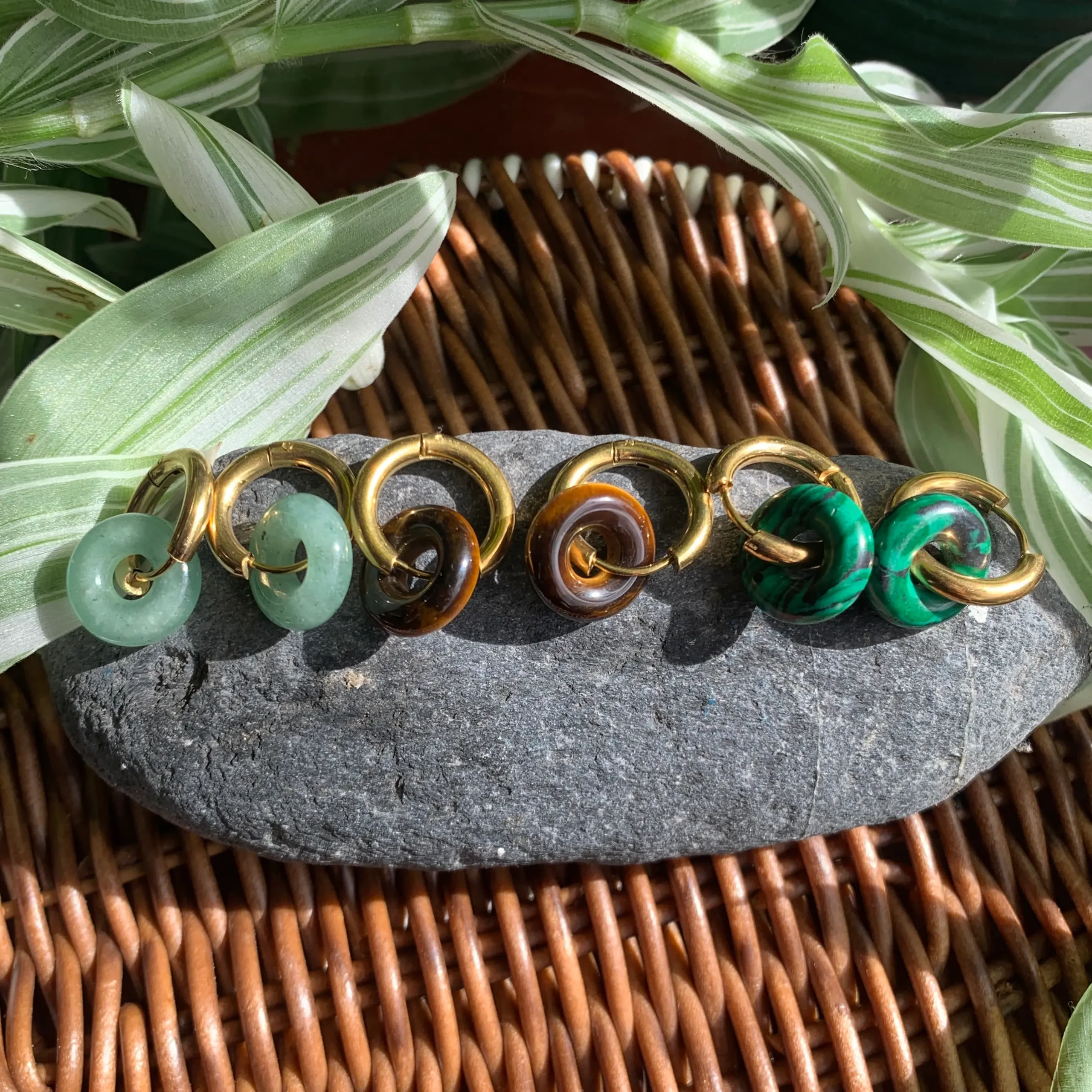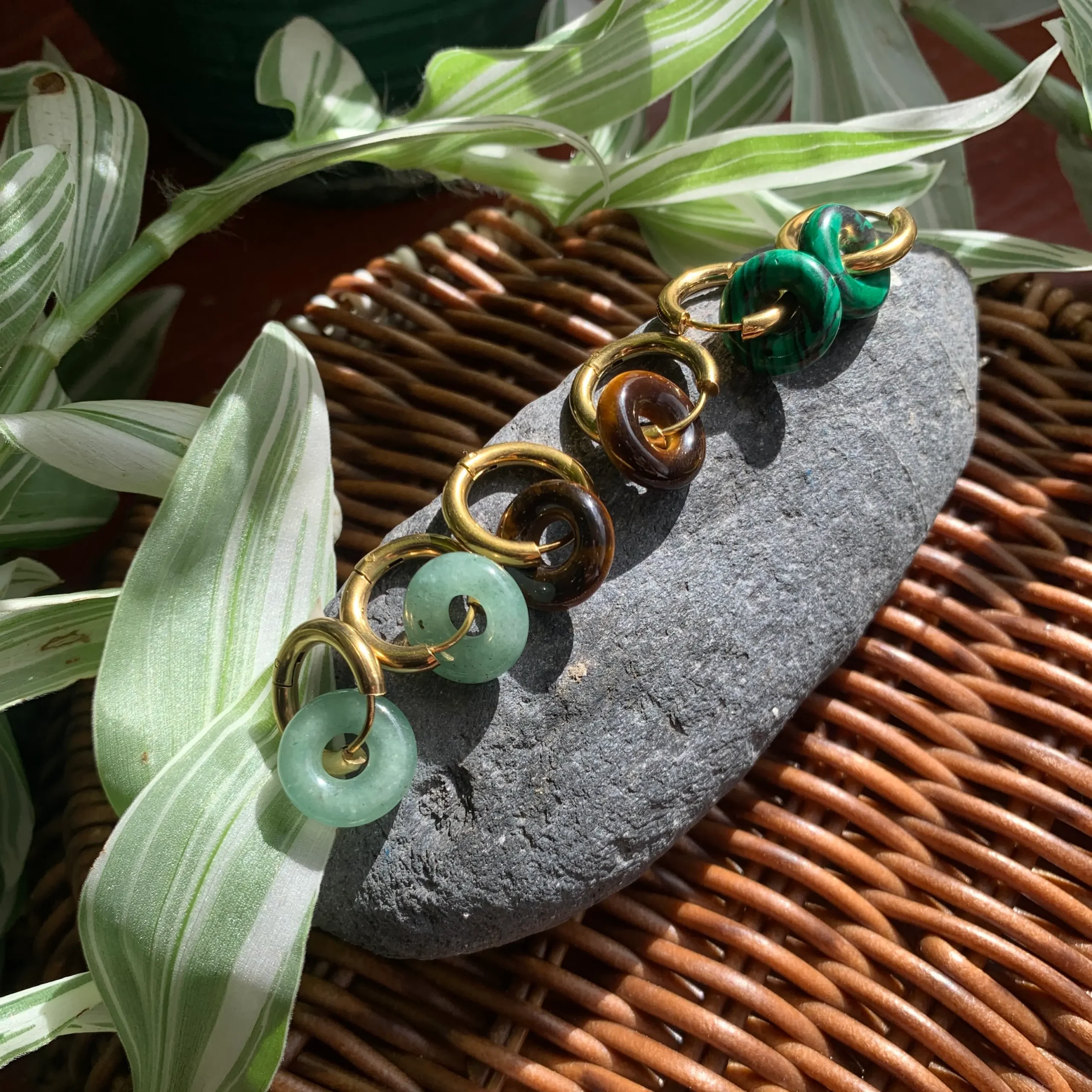 Disponibles en aventurina verde, ojo de tigre y malaquita, son ideales para quienes buscan joyería con energía, personalidad y durabilidad.