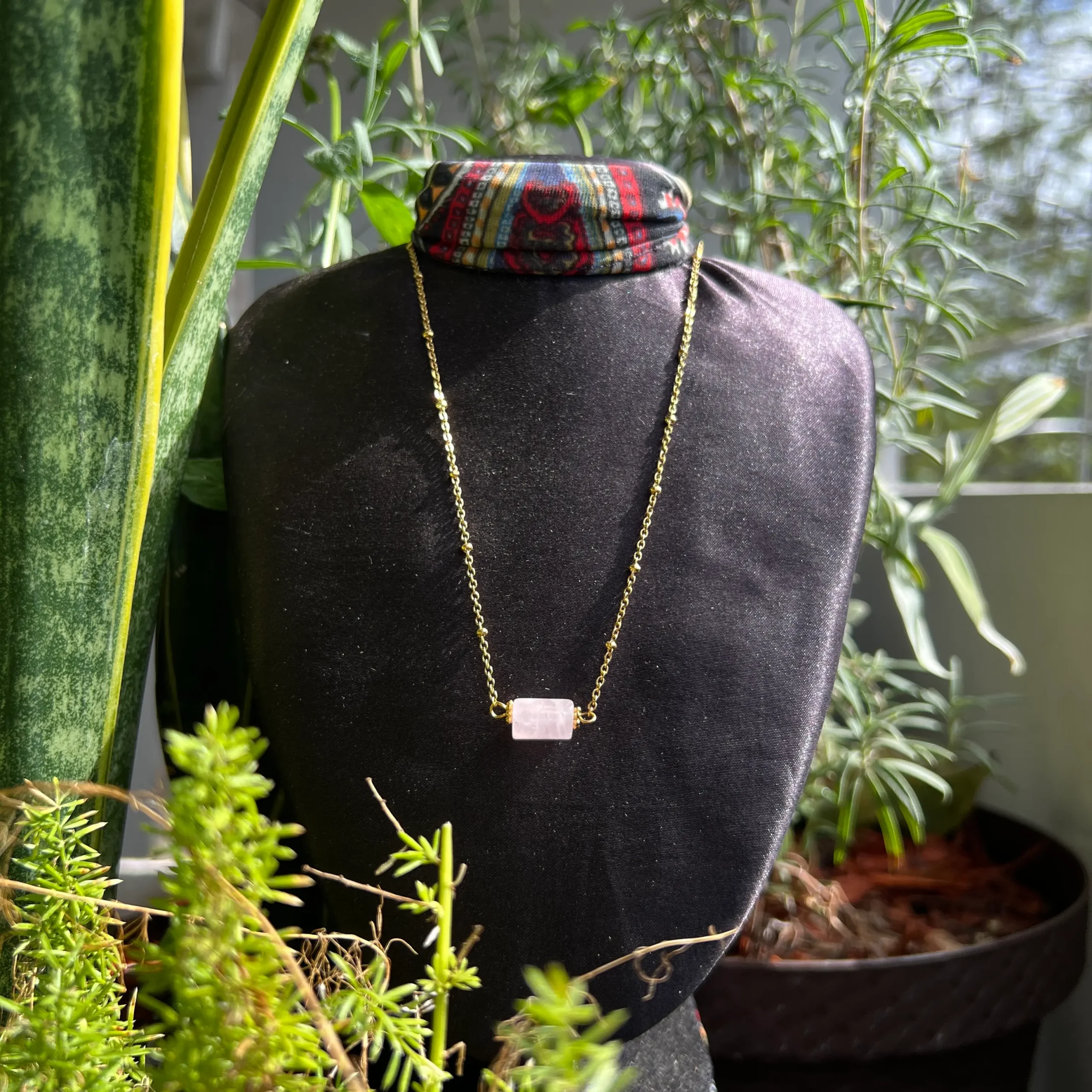 Este collar es el equilibrio perfecto entre minimalismo elegante y energía natural. Disponible en aguamarina o cuarzo rosa, está montado con acero inoxidable, ideal para uso diario por su resistencia y estilo atemporal. Su largo de aprox. 40 cm + 5 cm de extensión lo hace perfecto para llevar cerca del corazón, ya sea como pieza protagonista o en layering con otros collares.